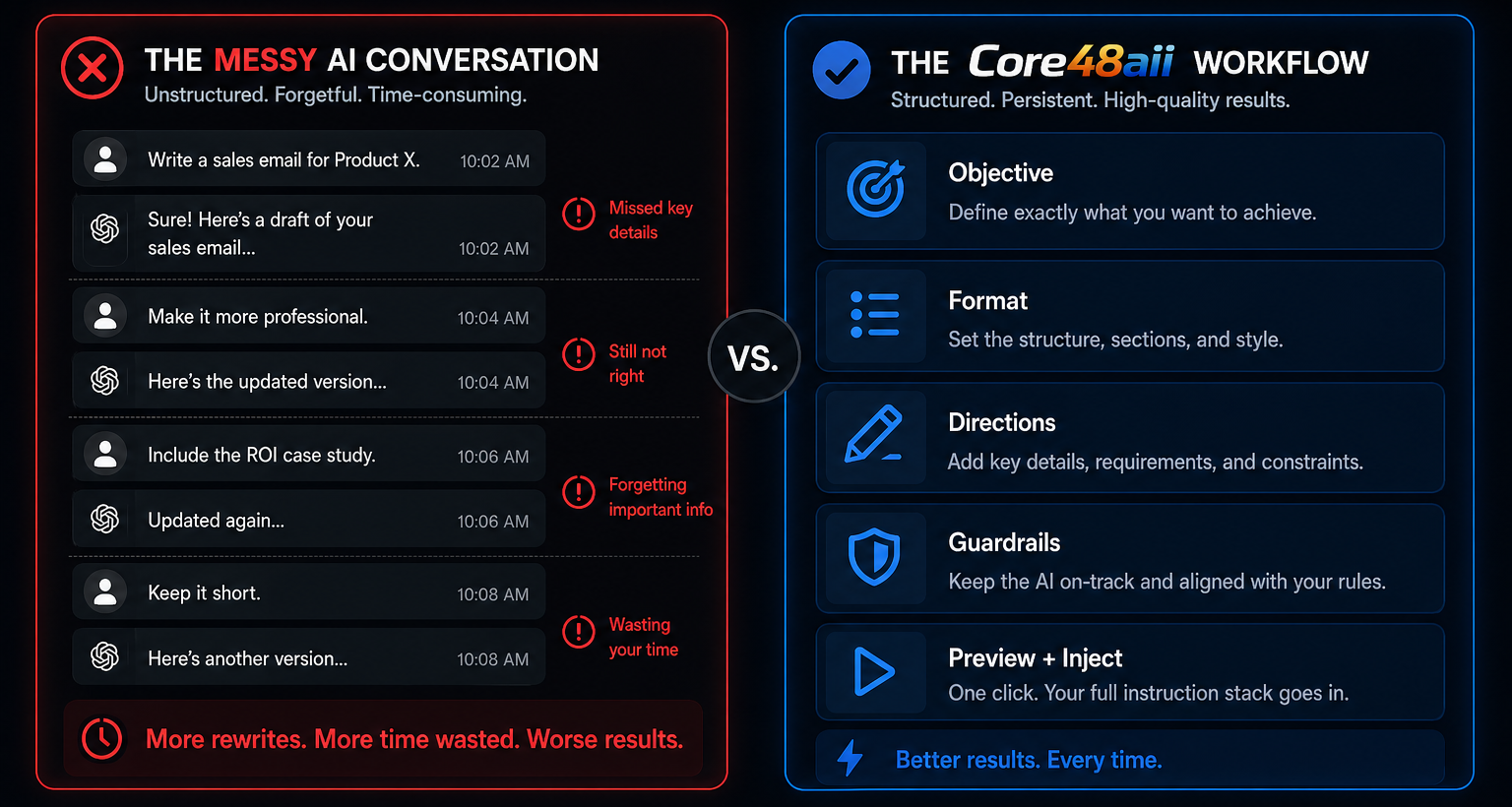Core48aii gives you a structured workspace so you stop rewriting prompts, losing context, and starting over.